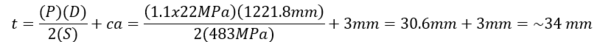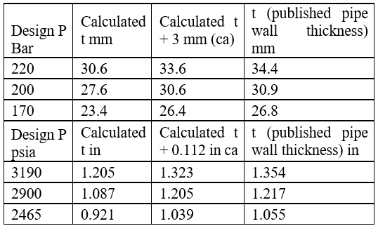 En la ecuación Barlow, no incorpora una previsión para la corrosión. Si incluimos 3 mm como representativo (cp), se ve lo siguiente:
