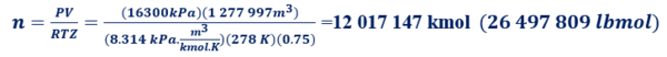 Donde P es la presion ponderada entre entrada (22000 kPa or 3190 lpca) y descarga (10600 kPa or 1537 lpca), estas presiones reflejan 16300 kPa (23663 psia), T es la temperatura ponderada en el gasoducto (5 ⁰C=41°F o 278 K=500.4 °R), Z es la compresibilidad de of 0.75 and R es la constante universal del gas (8.314 kPa.m3/kmol. K o 10.732 lpca.pie3/lbmol-°R).