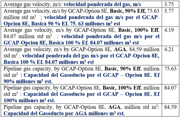 La metodología aplicada arriba demuestra como los gasoductos de larga distancia con correlaciones/líneas de gas, aplicando (ecuaciones BASIC and AGA ) pueden ser aplicadas en la evaluación de los gastos de diseño . Se notó que la Ecuación Básica con 90 % de eficiencia reflejo los resultados medidos en capacidades muy cercana con ecuación básica con eficiencia de 90 %. Fue notado que la ecuación Básica con 90 % reprodujo con mucha cercanía los resultados medidos de las citadas líneas de flujo.