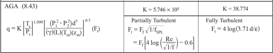 La ecuación AGA estima el factor de fricción bajo dos premisas, “parcialmente turbulento”, y turbulencia completa. La turbulencia parcial es presentada en la ecuación Colebrook-White para las tuberías lisas. La presunción “tubería lisa” es corregida aplicando un factor de arrastre, Ff, el cual reconoce varias condiciones de la tubería: condiciones de la superficie interna, soldaduras, cambios de dirección de flujo, válvulas de aislamiento, etc. La región de “turbulencia completa” existe independiente del número Reynolds, y solo depende de la rugosidad de la línea.