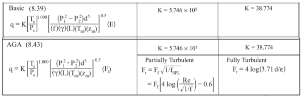 The AGA equation estimates the friction factor under two conditions, “partially turbulent” and “fully turbulent”. The “partially turbulent” correlation is the Colebrook-White equation for smooth pipe. The smooth pipe assumption is corrected using a drag factor, Ff, which accounts for several pipeline characteristics: pipe wall condition, welds, changes in the direction of gas flow, isolation valves, etc. In the “fully turbulent” region the friction factor is independent of Reynolds number and depends only on the dimensionless roughness of the pipe.