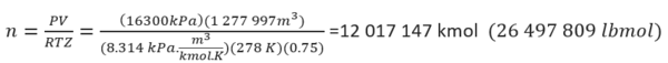 Where P is the average pressure between inlet (22000 kPa or 3190 psia) and outlet (10600 kPa or 1537 psia) pressures amounting to 16300 kPa (23663 psia), T is the average temperature in the pipeline (5 ⁰C=41°F or 278 K=500.4 °R), Z is the average compressibility of 0.75 and R is the universal gas constant (8.314 kPa.m3/kmol. K or 10.732 psia.ft3/lbmol-°R).