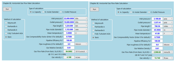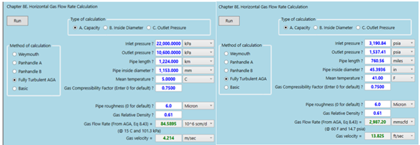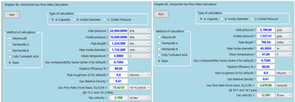 The methodology used above demonstrates how standard long distance pipeline flow correlations/equations (BASIC and AGA equations) can be used in evaluating the design flow rates of an installed or of an operating pipeline. It was noted that the Basic equation with 90%-line efficiency matched the published design capacity very closely.