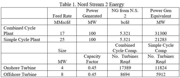 La corriente capacidad Eólica de Alemania cuenta con 28,230 turbinas en tierra con una capacidad integrada de 56 GW (56000 MW) [9]. Para re-emplazar los flujos del gas en el N.S. 2 requeriría que Alemania instale 17,389 Turbinas Eólicas de 4 MW de capacidad de 4 MW, o esencialmente el 56% de su capacidad actual.