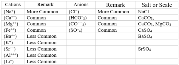 Most produced and sea waters contain many dissolved (soluble) minerals/components. The positive (+) charge constituents like Na+ and Ca++ are called cations. The negative (-) charge constituents like Cl- and CO− −3 are called anions. Table 1 shows typical mineral constituents in produced and sea waters. Primary salts found in produced waters are ~ 75 wt% NaCl, ~ 20 wt% CaCl2 and ~ 5 wt% MgCl2.