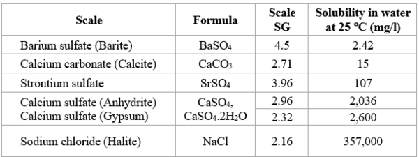 When the solubility limits of one or more components is exceeded, scale forms. Table 2 shows solubility of typical scales at 25 °C [77 °F]. Scale is precipitation and deposition of inorganic minerals from brine.