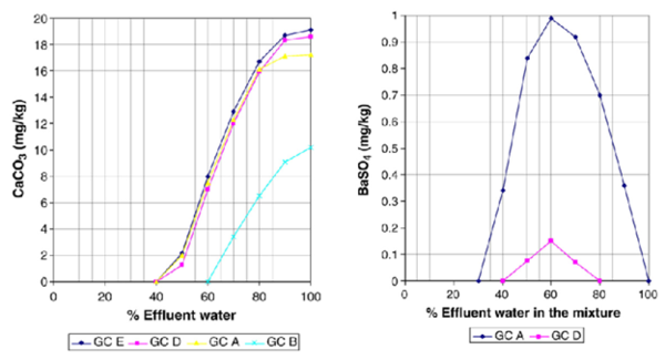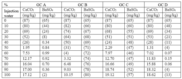 C. Water flooding/injection for enhanced oil recovery where different waters are mixed. A computer software can be used to evaluate the experimentally measured chemical analyses of effluent waters and that of formation water and determine the tendency of scale formation. The scaling tendency for the commingling of individual effluent waters with formation water at reservoir temperatures and pressures may also be predicted. Salman et. al. investigated the scaling tendency for four Gathering Centers (GC) of an oil field in the State of Kuwait [3]. Attention was made on the scaling tendency of CaCO3 and BaSO4 for various mixing proportions of effluent water with formation water.