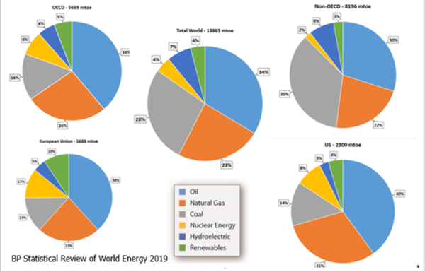 Twenty years ago, hydrocarbons provided roughly 87% of the global energy demand. During that time period, the world’s energy use increased by 50%. This is roughly equivalent to adding all of the 2017 OECD countries over that time period. (Organization for Economic Co-operation and Development, and includes the US, EU, and Japan). In 2018, wind and solar PV (Photovolatic) provided only 4% of the world’s total energy demands. Primary energy consumption grew at a rate of 2.9% – nearly doubled it’s 10-year average. This was the fastest growth since 2010.