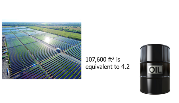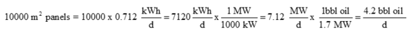 Solar is by far the least cost effective nor efficient way to generate baseload energy requirements. It would take 10 000 square meters, 107,640 ft2 of solar panels to produce the energy equivalency of 4.2 bbls of oil per day. Note that surface area required is equivalent to roughly 2.5 football fields. See Figure 8 and conversion below: