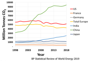 The European Union is close to achieving its targets through policy. However, there has been a price to pay as a result in terms of consumer cost. Their emissions remained flat for 2018. The U.S. emissions have largely been going down, but that is largely attributed to natural gas replacing coal. Despite many countries’ best efforts to reduce their carbon emissions, these reductions cannot counteract the amount of CO2 emissions that are greatly increasing from China and India as their economies modernize. Refer to Figures 3 and 4.