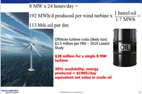 Offshore wind turbines are incredibly expensive given the technology and the investment to build them and bring the high power transmission lines via sub-sea. Assuming a typical offshore wind turbine with a 8 MW capacity, a 40% efficiency, and that the wind blew 24 hours a day, that turbine would produce a net equivalent of 45 barrels of oil per day. Wind turbines do not have 100% availability factors. See conversion below and Figure 7 below.
