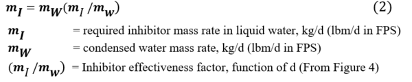 From Figure 4 for depression temperature, d = 12.1 °C (22 °F), the required ratio of mass of inhibitor in the liquid water phase to mass of condensed water, (mI / mW) for three inhibitors are determined and shown in Table 3. The required inhibitor rate in liquid water phase, mI, the fourth key factor, can be calculated by equation 2.