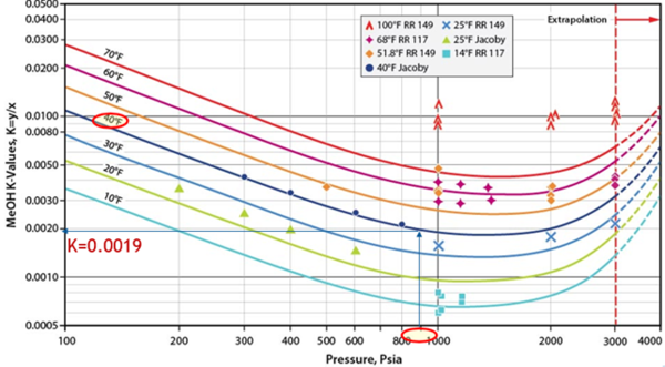 The MeOH losses to liquid hydrocarbon phase can be estimated by our proposed Figure 6 and equation 3.