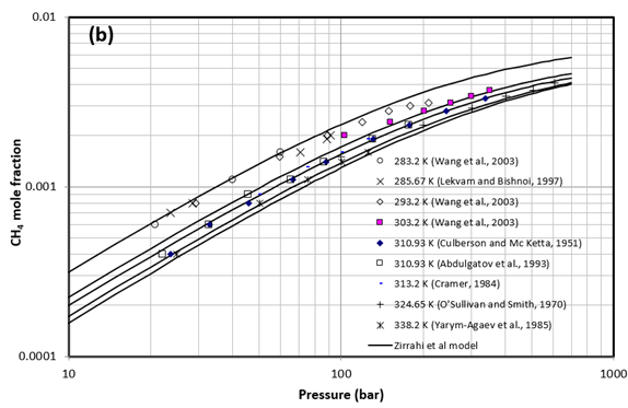 Figure 1 presents a comparison between the experimentally measured CH4 solubility in water by different investigators and the results of the proposed model by Zirrahi et al. [2]. Solid lines are the results obtained from the proposed model at (a) 298.15 K (25°C), and (b) 338.2 K (65.1°C), 324.65 K (51.5°C), 310.93 (37.8°C) K, 303.2 K (30.1°C), and 285.67 K (12.5°C).
