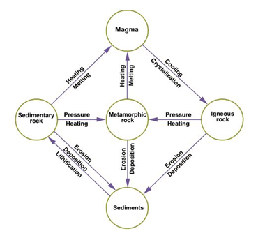 New igneous, sedimentary and metamorphic rocks are continually being formed from one another by currently active earth processes. This involves a continuous cycle of rock production, alteration and consumption to produce new rock types. The changing of rock types comprises the Rock Cycle (Fig. 4), which characterizes the inter-relationship of rock types, and demonstrates that virtually any rock type can result from alteration of a pre-existing rock type whether by remelting, metamorphism or erosion.