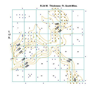 Figure 7 Thickness Map of Pennsylvanian stream channel sandstone reservoir, Kansas. From Walters, Gutru, and James, 1979. Permission to publish Tulsa Geological Society.