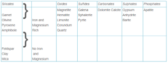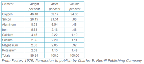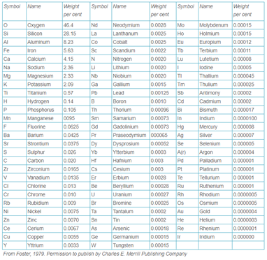 Average composition of the earth’s continental crust includes larger amounts of the most common minerals and much smaller percentages of the rare constituents (Table 1). The first eight elements (Table 2) are the most common and constitute the basic ingredients for most continental crystal rocks, which are predominantly silicates and to a lesser extent oxides. Even less common are sulfides, chlorides, carbonates, sulfates and phosphates.