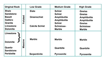 Metamorphic Rocks: Pressure, heat and catalytic action related to chemical agents are important factors in changing pre-existing rocks into rocks with different textures and compositions. The process which involves these agents is called metamorphism and results in the formation of metamorphic rocks. Crystal structure, bedding, texture, and other characteristics are changed by metamorphism, which occurs locally or regionally depending upon conditions.