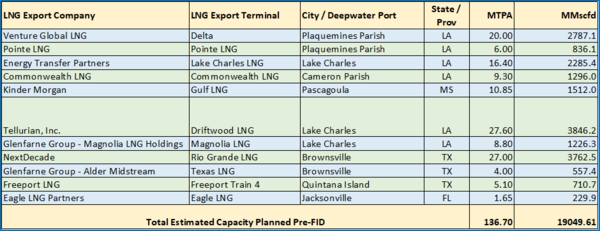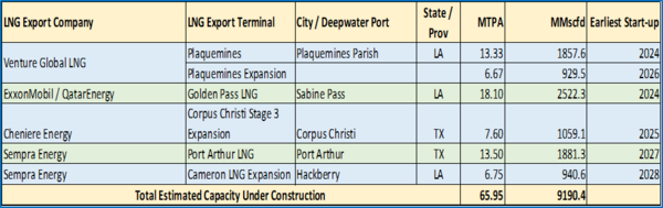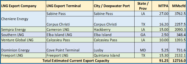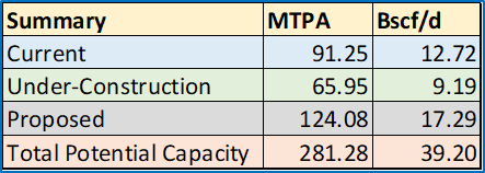 The current liquefaction capacity in the U.S. is summarized in Table 1 below.