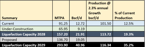 Table 5 provides a comparison of current, under construction, and proposed liquefaction capacity with the current U.S. gas production rates.  Note, the table assumes all plants under construction are on-line and at capacity in the year 2028.  The proposed liquefaction plants are assumed to be on-line and at capacity in the year 2029.  An assumed underlying 2.3% annual natural gas production rate is included to estimate “possible” gas production using the 5-year average annual growth from the Statistical Review of World Energy 2022 [5].