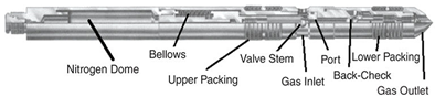Figure 7 [9] illustrates the various integrated components of a typical GLV. Inlet/Outlet gas ports, dome and bellows configuration, packings, and reverse flow check valve are shown. GLV’s rely on a restriction orifice (identified as the port in Figure 7) for control of injection gas flowrate. Correct design and configuration ensure that “critical” flow for a given orifice size is avoided. The casing gas injection rate and flowing conditions should, by design, yield subsonic flow through the selected Choke, or port. Further discussion on this topic will be addressed in Part II of this series on Gas Lift.