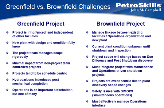 The first item we need to establish is what is the difference between a greenfield and brownfield project. This graphic below summarizes the main challenges for each type of project.